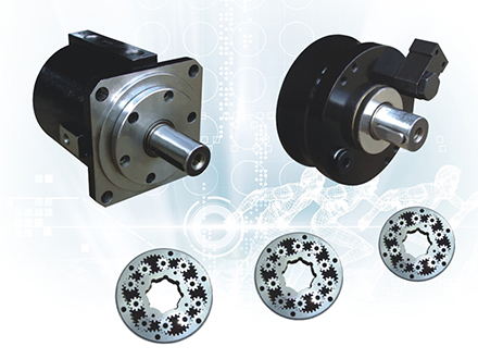 马达的结构包括六角形的内齿圈、四角形的外齿太阳轮和10个行星齿轮,由相邻两个行星齿轮、外齿圈、太阳轮、侧板和进岀油口构成了马达的工作腔。星齿轮完成工作腔之间的密封,并通过遮盖板上适当的油孔控制油液的进出,同时使工作腔由工作循环转入排油循环,在太阳轮转动过程中,工作腔的容积发生变化,不断重复吸油和排油,工作油液在高压力的作用下通过进油孔进入工作腔并使之容积变大,造成太阳轮转动,太阳轮通过联轴器与马达输出轴结合,将扭矩传递给接受机构。乳化液和矿物油可以作为MRF系列液压马达的工作介质。