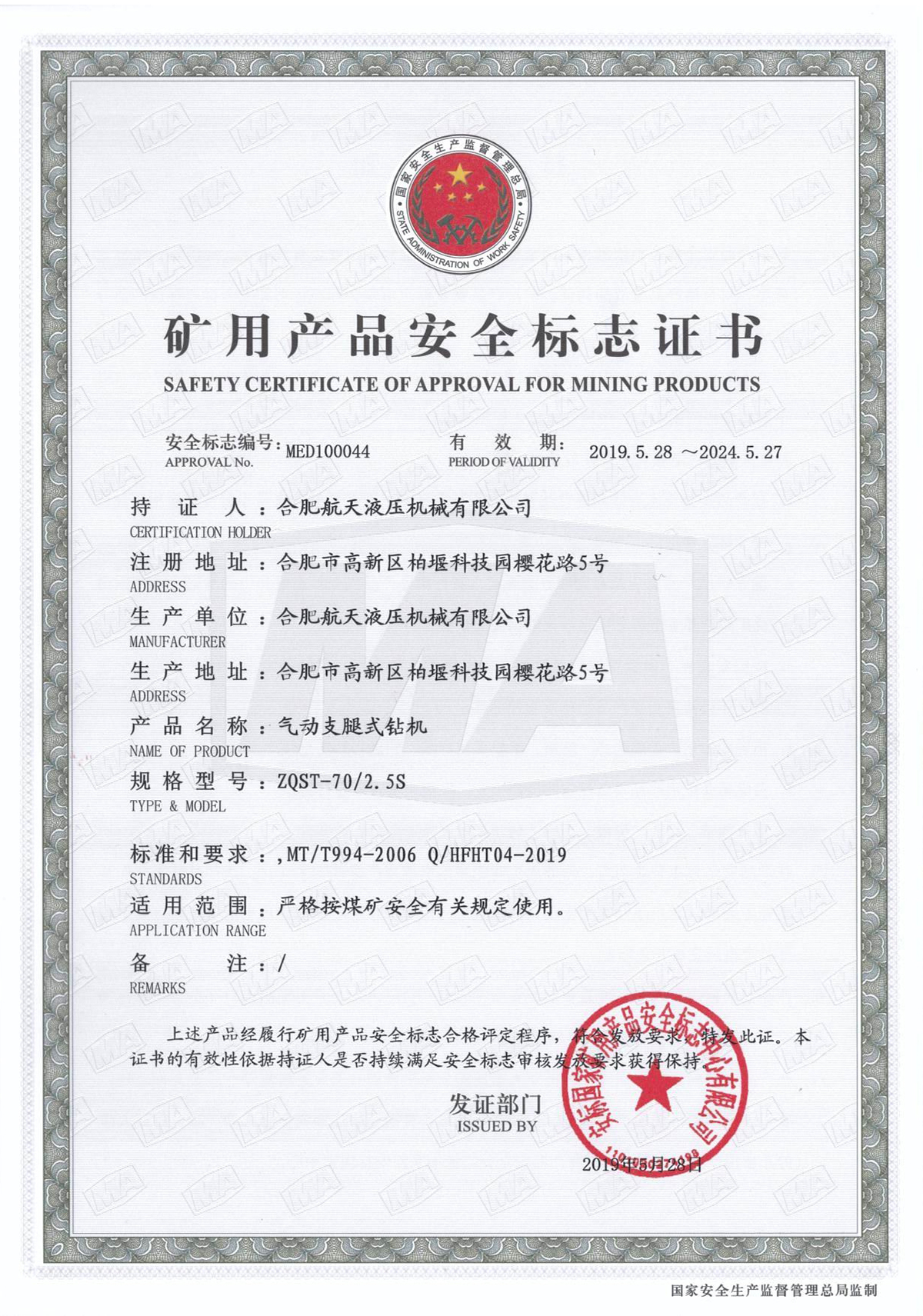气动支腿式钻机-矿用产品安全标志证书